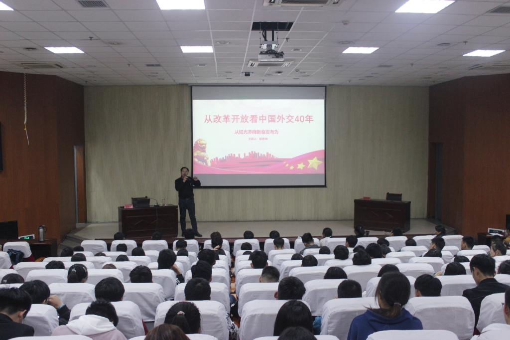 11月23日下午,动物科技学院在新图书馆一楼举行从改革开放看中国外交40年主题讲座。讲座邀请新乡学院学生处处长郭贵中主讲。院党委副书记陈松玲、团委书记张书响、正科级辅导员高莉、团委副书记刘璐、辅导员张帅鹏以及学生代表参加。