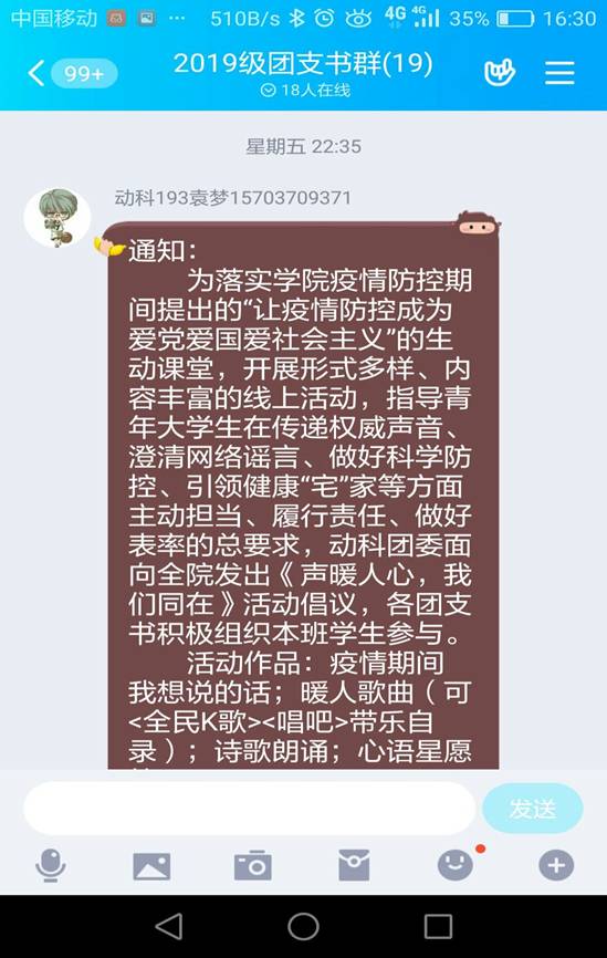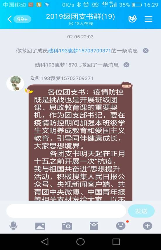 多频次主题班会,对学生积极正面引导。各班召开“防疫行动,人人有责”等主题班会,通过qq全员通话、微信视频等网络直播形式开展主题班会,学院团委老师在会上向同学们传达上级通知精神,提出相关注意事项。号召学生用实际行动重视疫情防控,注重个人防护,在力所能及保障安全的情况下,积极投入到本地疫情防控中来。同时,每位辅导员还对学校停课不停学的要求进行了安排,希望大家好好学习,认真上课。每次班会还进行了学生问题反馈,以便达到师生双向互动,充分了解学生思想动态的效果。