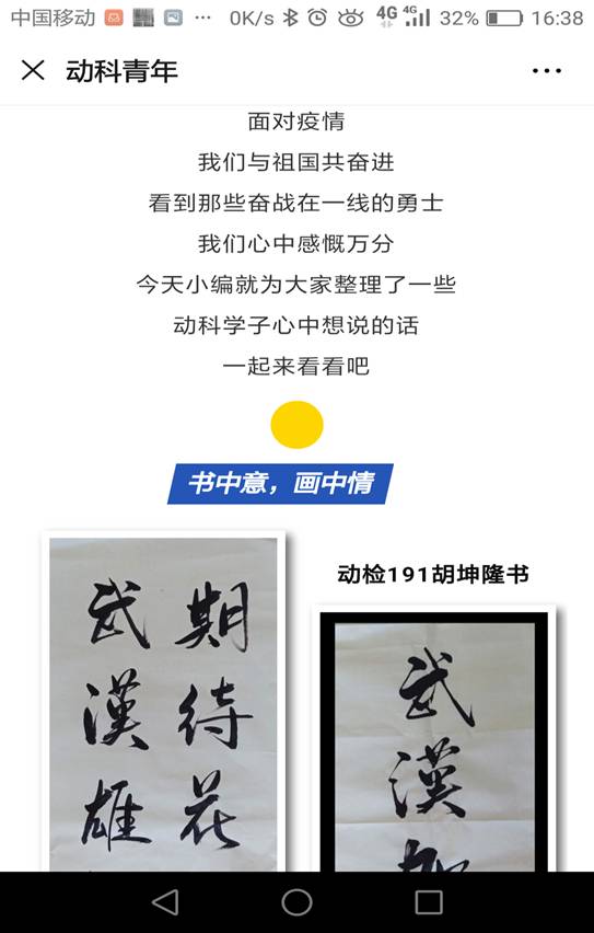 线上主题教育活动,促进学生思想提升。我院分别在2月5日、2月21日举行“抗‘疫情’,我与祖国共奋进”、“声暖人心,我们同在”线上主题教育活动。在疫情防控期间加强学生文明养成教育和爱国主义教育,引导大家的健康成长和思想境界,进行思想提升。其中,“抗‘疫情’,我与祖国共奋进”主要是通过五十字感悟、漫画制作、书法创作、红心传递、抗疫随拍等形式,引导广大团员相信党和政府,相信科学,积极弘扬“逆行”精神和努力奋斗精神,努力向担当者学习,坚定必胜的信念;“声暖人心,我们同在”主题教育活动是动科团委面向全院发出的活动倡议,主要通过疫情期间我想说的话;诗歌朗诵、暖人歌曲录制(可<全民K歌><唱吧>录制);心语星愿等音频形式向湖北人民、全国人民发出问候和祝福。活动一经发出,学生们积极广泛参与,这不仅是对湖北人民的声援,更是学生爱国主义情怀的充分体现。