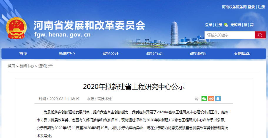 8月12日,河南省发展和改革委员会公示了2020年拟新建的137个省工程研究中心名单,我院申报的“畜禽疾病防控及智能预警工程研究中心”获批立项建设。