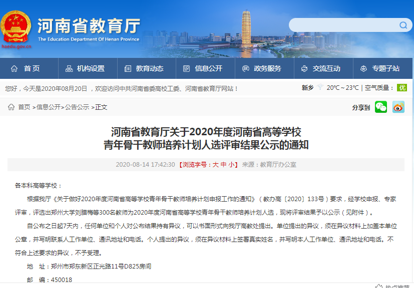 8月14日,省教育厅发布了《河南省教育厅关于2020年度河南省高等学校青年骨干教师培养计划人选评审结果公示的通知》,我院王磊和夏小静老师成功入选2020年度河南省高等学校青年骨干教师培养计划。