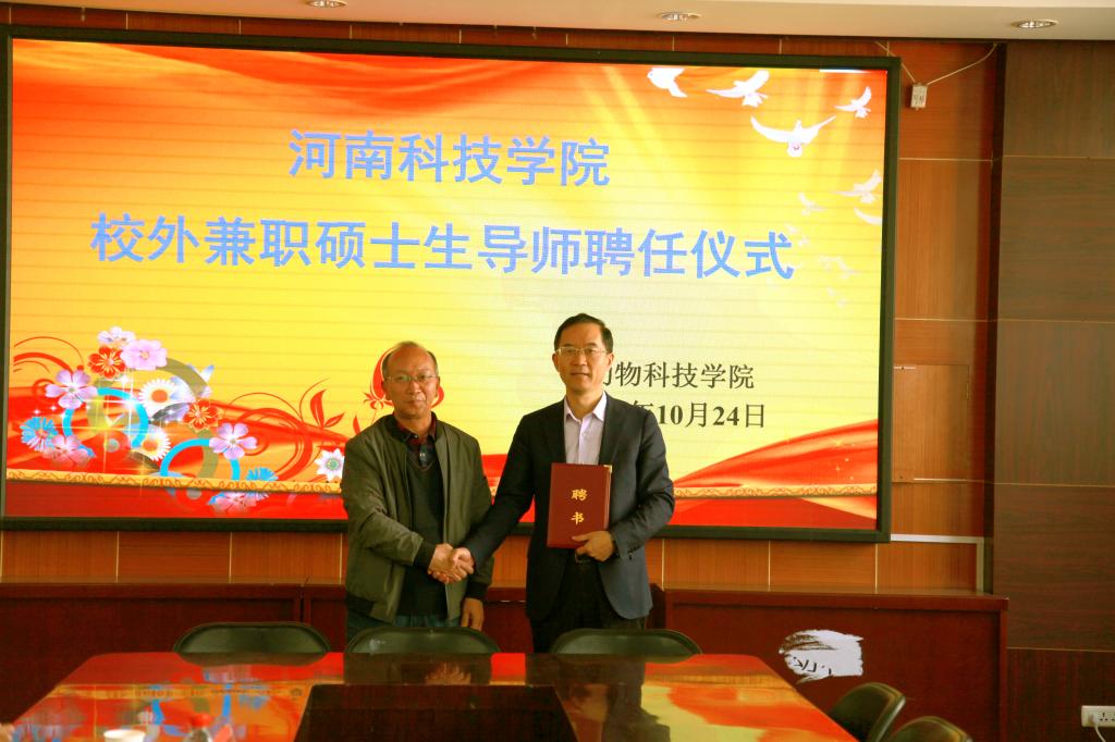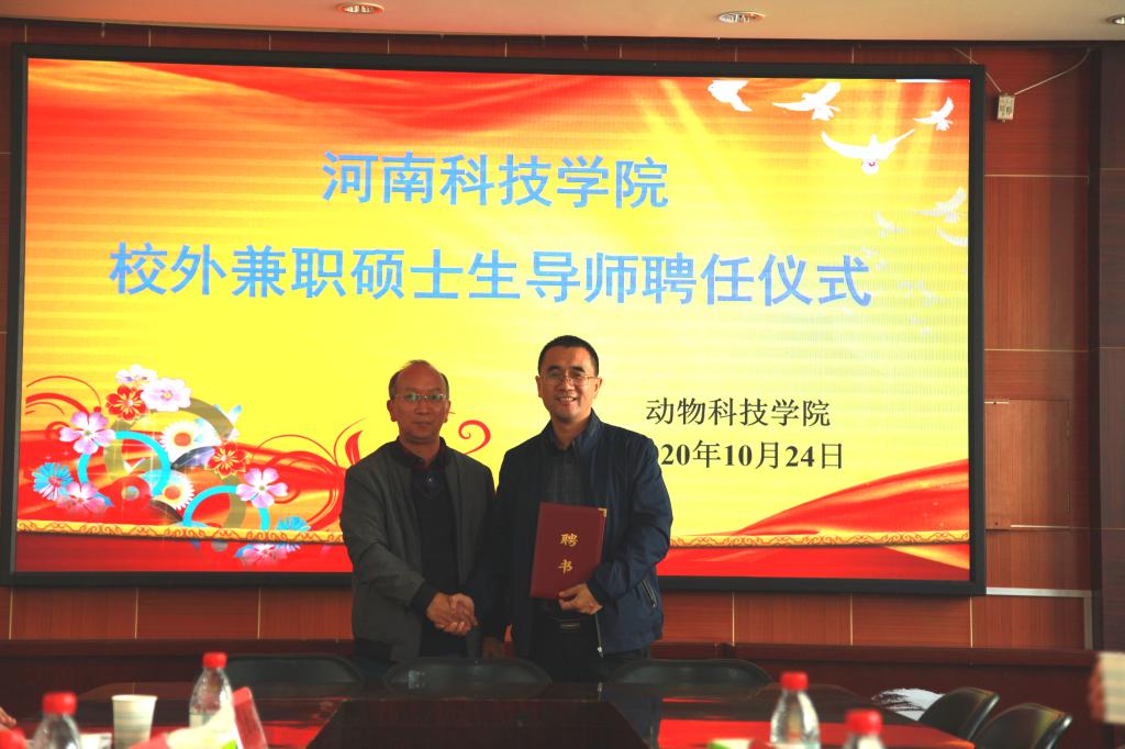 其次,研究生处处长赵明富教授为仇华吉研究员和孙元研究员颁发了河南科技学院校外兼职硕士研究生指导教师聘书。