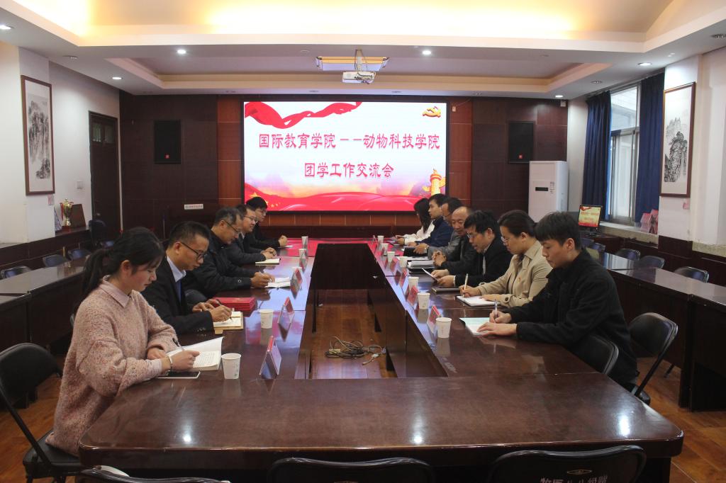 11月5日,国际教育学院与动物科技学院团学工作交流会在E302举行,国际教育学院党委书记张平、副书记吴艳兵,团委书记李威,动物科技学院党委书记郭东升、副书记杨国友,团委书记张书响和各年级辅导员以及学生代班参加。会议由动物科技学院党委副书记杨国友主持。