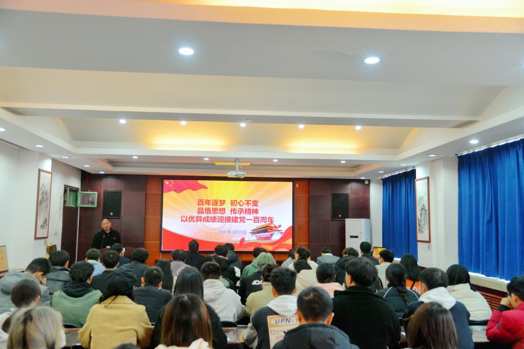 郭东升以“百年逐梦 初心不变 品悟思想 传承精神,以优异成绩迎接建党一百周年”为题,围绕“中国共产党的百年征程”“永葆初心—习近平讲述百年征程”“共产党人初心使命的诠释”“深刻品悟,积极践行时代精神谱系”“科学谋划,率先垂范,开好局,以优异成绩迎接建党一百周年”五个方面与同学们一起重温党史,共同回顾中华民族百年复兴的辉煌历程。