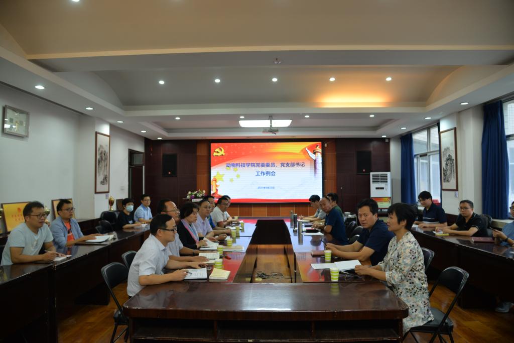 9月24日下午,动物科技学院召开党委委员、党支部书记工作例会。学院党委书记、副书记,党委委员和各党支部书记参加会议。会议由学院党委书记郭东升主持。