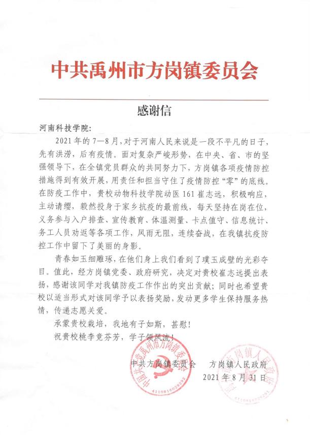 近日,我院收到禹州市方岗镇人民政府发来的一封感谢信,对我院动医161崔志远同学在今年抗洪防疫所做出的突出贡献表示真切感谢。