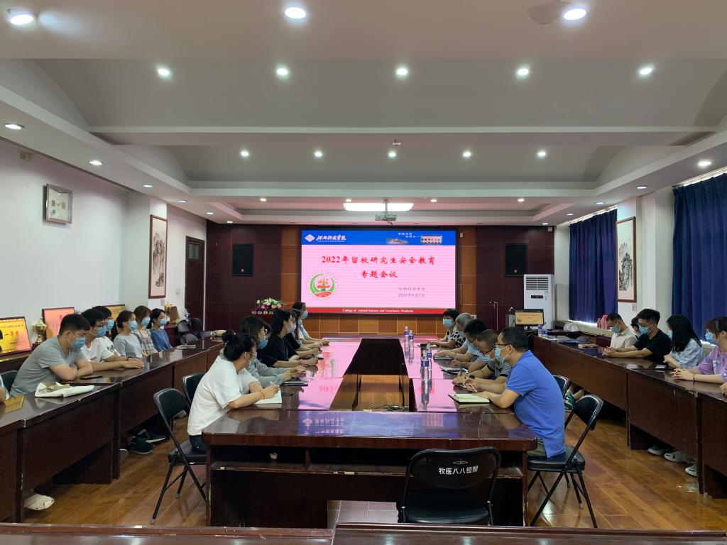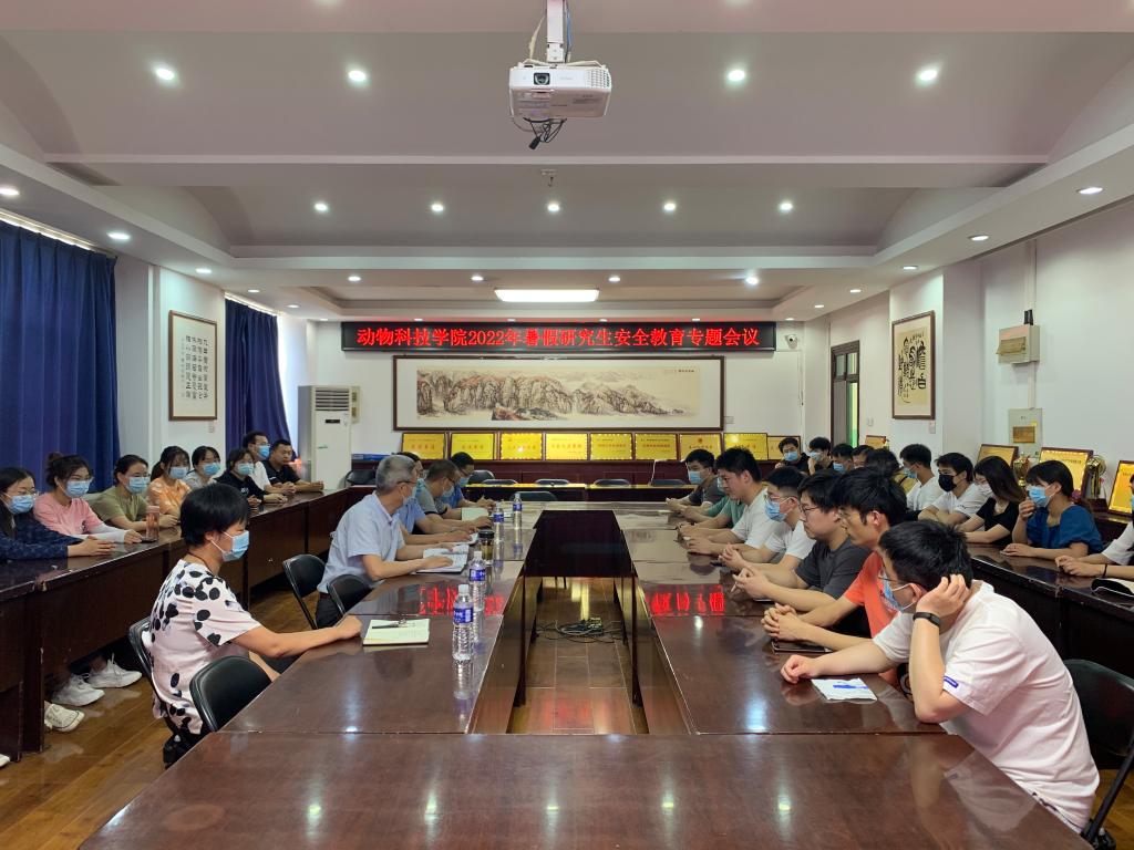 为切实做好2022年假期期间留校研究生的科研、生活、安全等工作,筑牢疫情防控工作防线,6月2日上午,动物科技学院于实验楼E302会议室召开2022年暑假留校研究生安全教育专题部署会。参加会议的有院长马金友教授,副院长贺永惠教授、葛亚明教授,动物医院院长安志兴博士,研究生秘书徐彦召博士,研究生党支部书记魏小兵老师。会议由马金友院长主持,全体留校研究生分两批参加了本次会议。