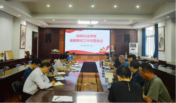 8月31日下午,动物科技学院在E302会议室召开巡视整改工作专题会议,学院党政班子、党委委员及全体党支部书记参加会议,会议由学院党委书记郭东升主持。