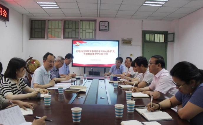 5月18日下午,动物科技学院在E407会议室召开党委理论学习中心组(扩大)学习贯彻习近平新时代中国特色社会主义思想主题教育集中学习研讨会。学院处级干部及部分科级干部参加会议,会议由院党委书记主持。