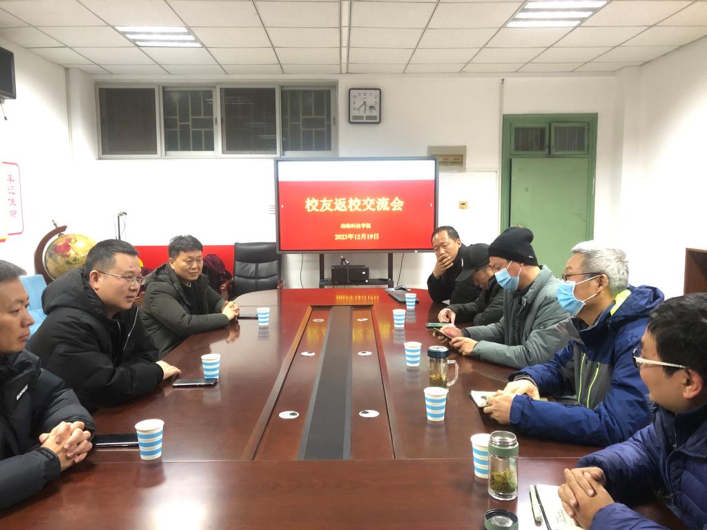 12月19日下午,动物科技学院动物科学专业2002级校友柳勇、岳峰、张绍钦一行3人返校进行交流,交流会在学院E407会议室举行。院党委书记胡付广、院长马金友、副院长徐彦召、研究生秘书孙华润、教师代表赵恒章和刘保国参加交流会,会议由徐彦召主持。