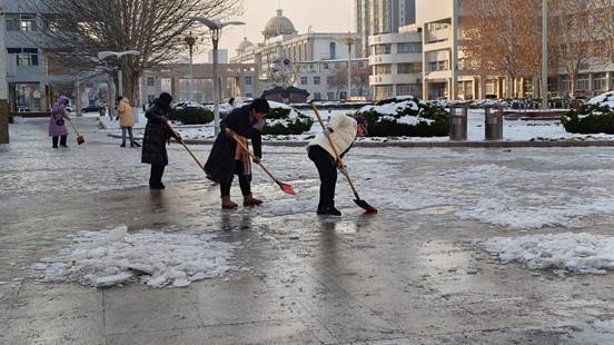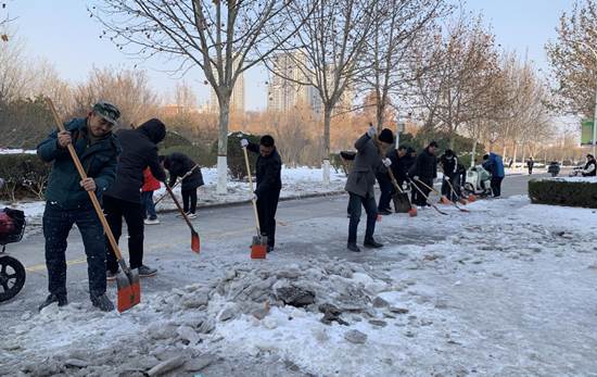 教师们齐聚实验楼内围,对零号楼前、实验楼内围及校园洗浴中心门口的主要道路进行铲冰除雪,大家手拿铁锹,不畏严寒,热情高涨,忙碌的身影构成了校园里一道靓丽的风景线。