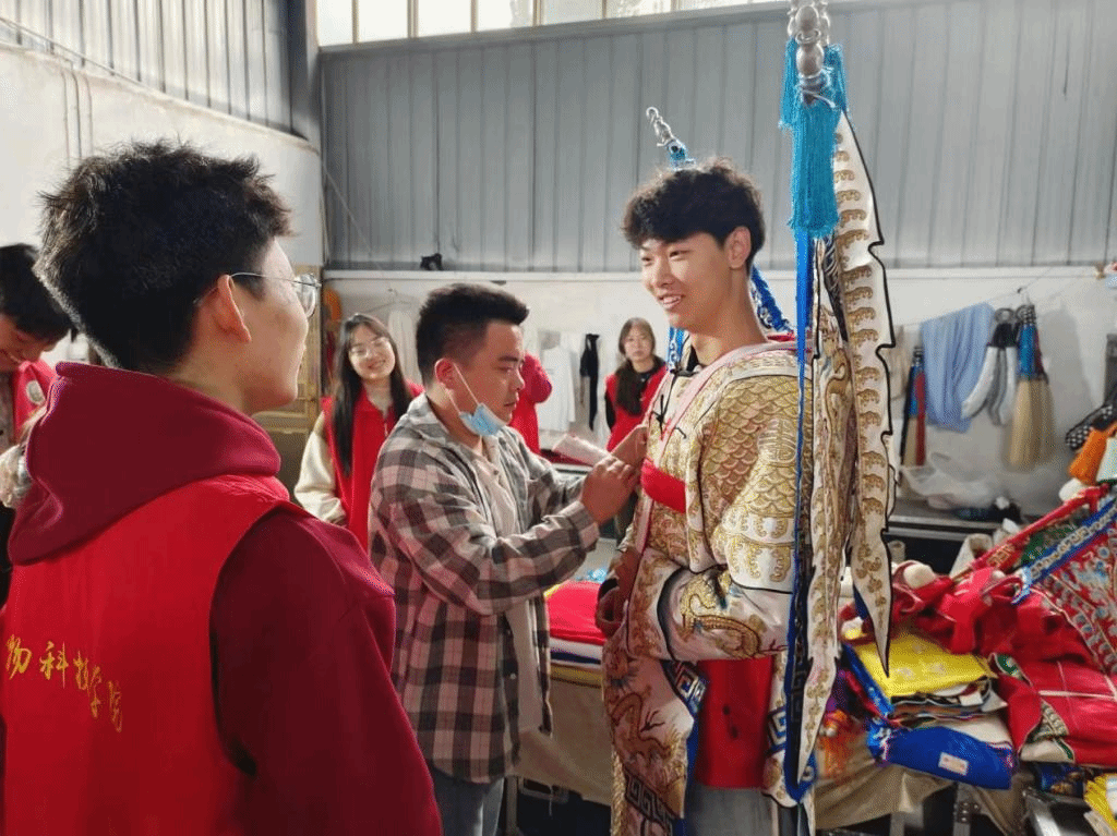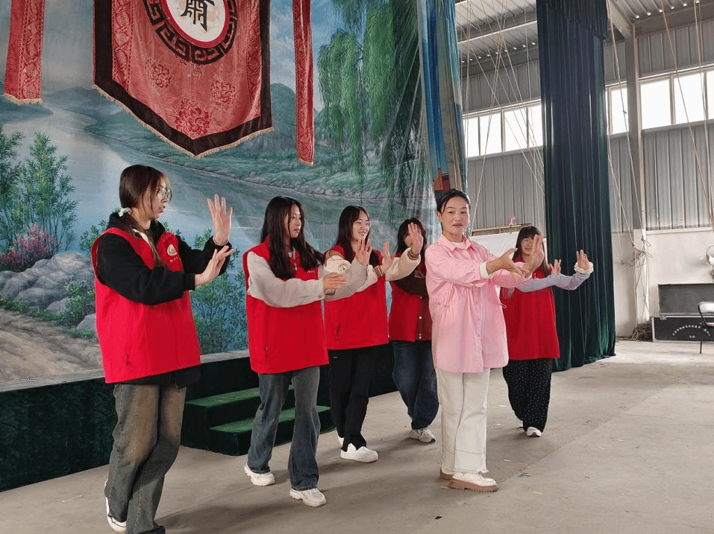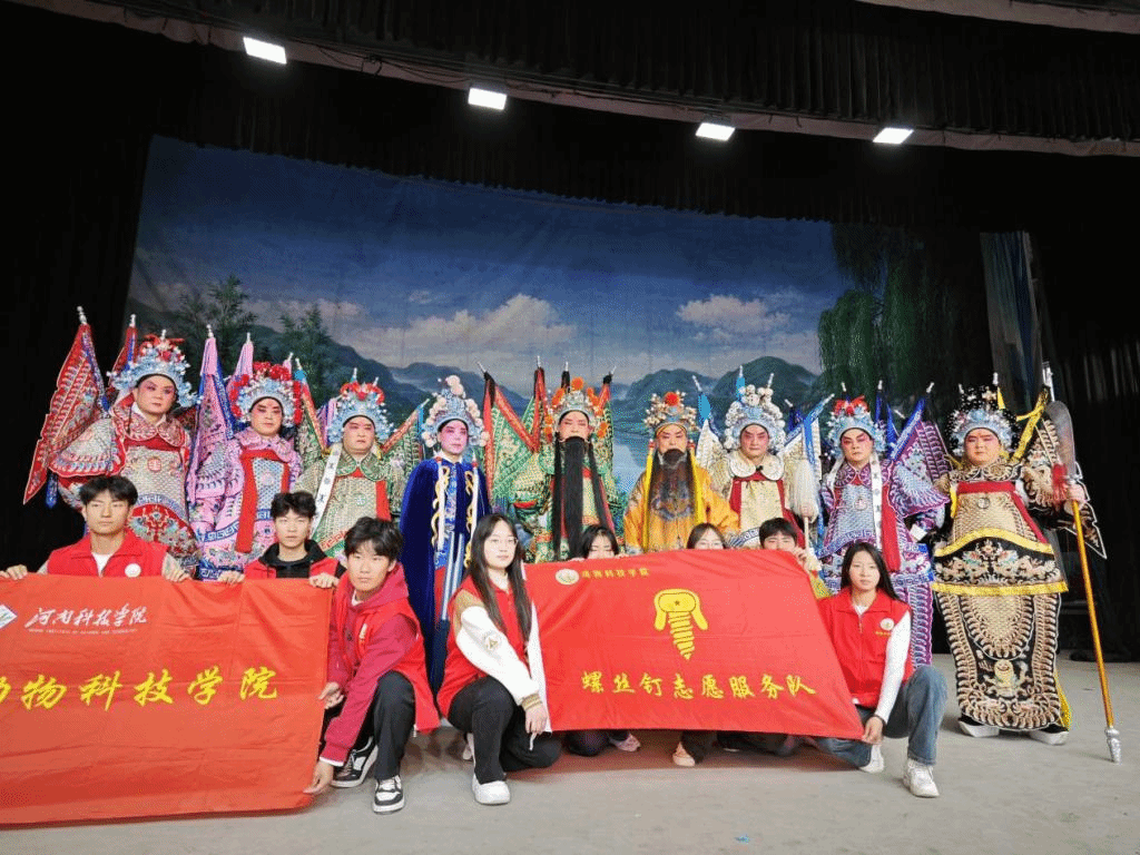4月15日,动物科技学院学生志愿者走进新乡市红旗区小店镇王连屯村,在王连屯文化大舞台与许昌市豫剧团进行深入学习交流,“沉浸式”体验豫剧魅力。