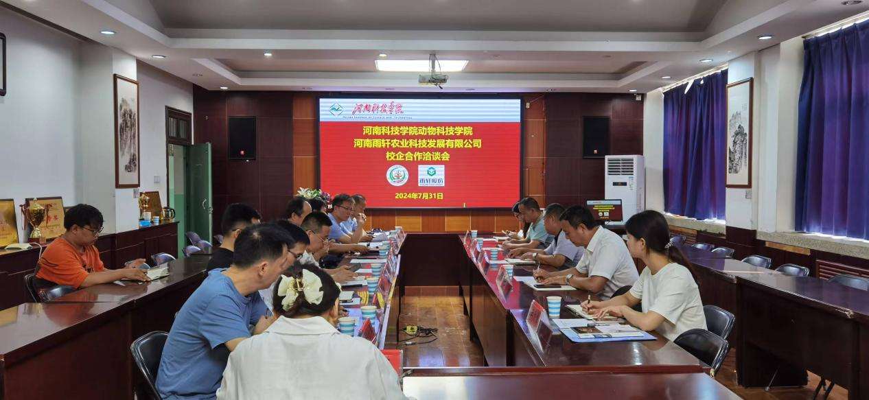 7月31日上午,动物科技学院与河南雨轩农业科技发展有限公司在E302会议室举行校企合作洽谈会。河南雨轩农业科技发展有限公司董事长马本川,总经理助理赵世界、副总经理袁希林,雨轩股份人资部主管袁慧莹、王曼曼,动物科技学院党委书记胡付广,计算机科学与技术学院院长高国红,数学科学学院副院长焦红伟,动物科技学院副院长贺永惠、徐彦召、王磊及教师代表出席了会议。会议由胡付广主持。