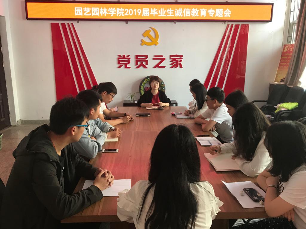 5月10日上午,园艺园林学院于B106会议室组织开展2019届毕业生诚信教育专题会,团委书记王莹老师以及学院19届贷款毕业生参加了此次会议。