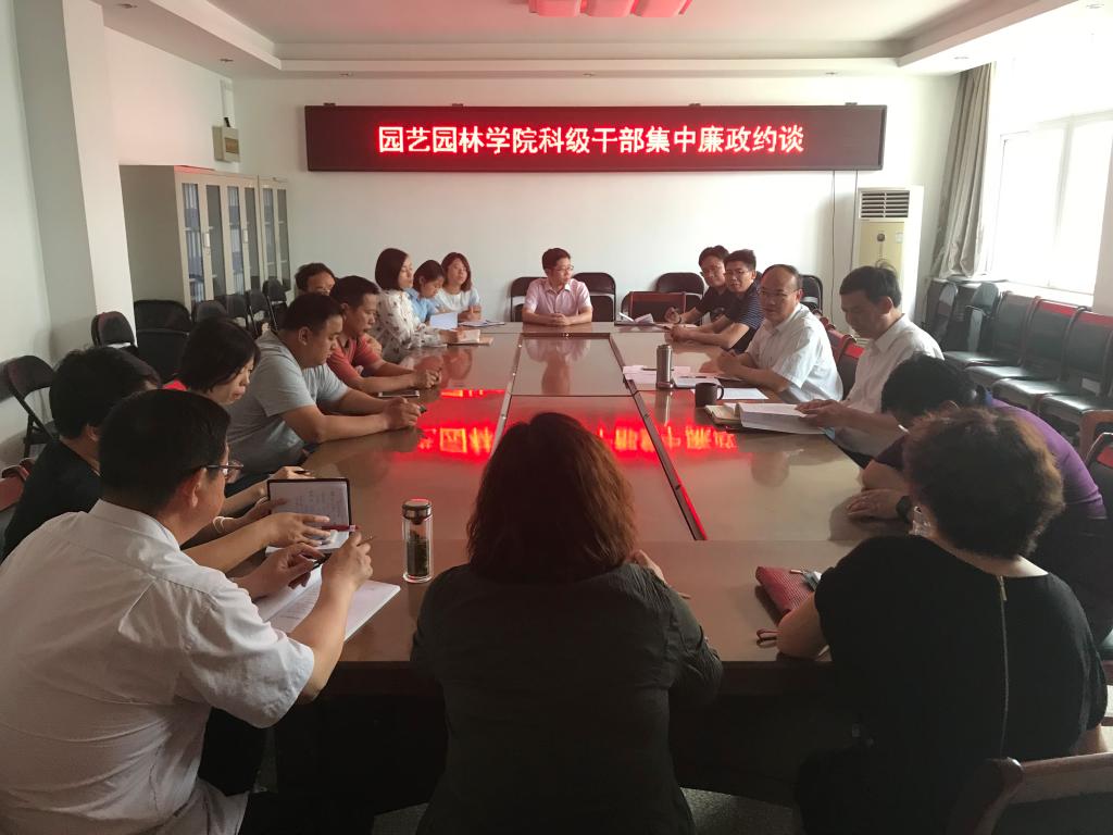 5月23日下午,园艺园林学院于实验楼B316会议室集中进行科级干部集中约谈会议。学院党政领导以及全体副科级以上中层领导干部30余人参加了此次约谈会议。会议由学院党委书记郜庆炉主持。