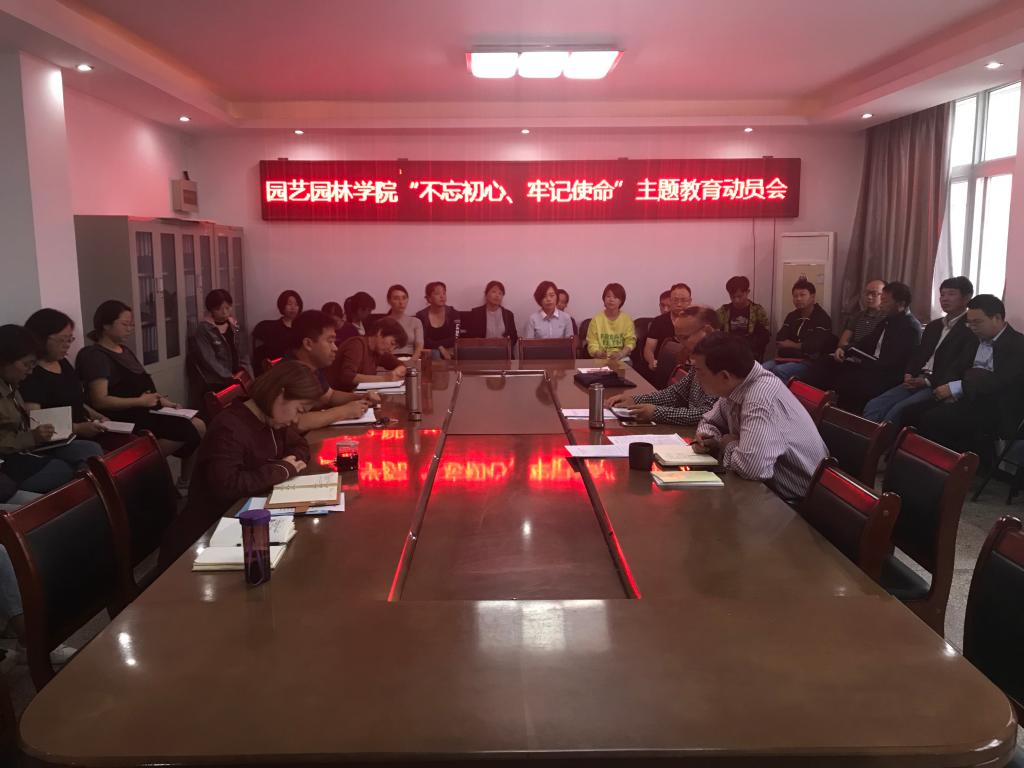 根据学校关于开展“不忘初心、牢记使命”主题教育的工作要求,9月12日,园艺园林学院在实验楼B316会议室召开“不忘初心、牢记使命”主题教育动员会。学院党政领导以及全体教工党员干部参加了会议。会议由党委书记郜庆炉主持。
