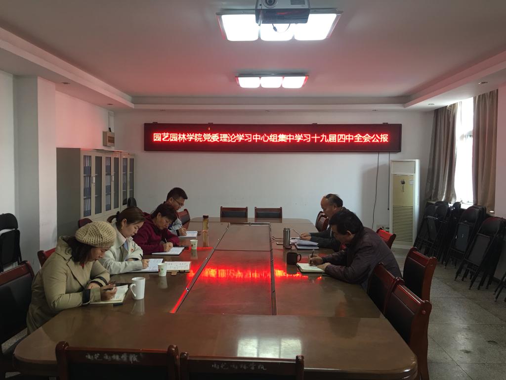 11月6日,园艺园林学院党委理论学习中心组于实验楼B316会议室集中学习党的十九届四中全会公报,学院党委中心组成员参加会议。会议由党委书记郜庆炉主持。