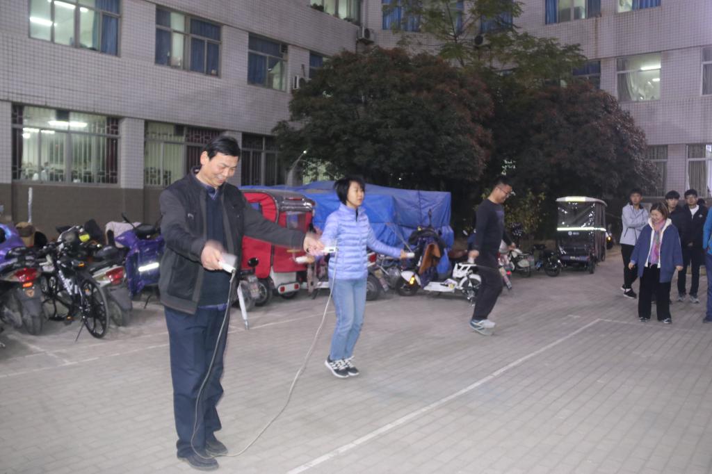 第二阶段进行的是单人跳绳,比赛现场,绳花飞舞,一道道灵动的身影跳动,组成极富韵律的风景,全体教工都漏出了运动带来的喜悦和欢快的笑容。