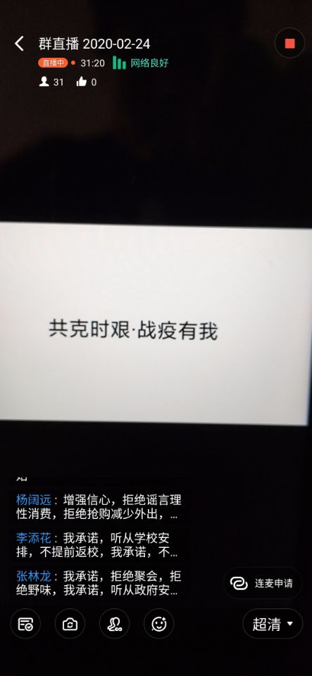此次线上主题团课活动中,各团支部主要通过以下内容进行:一、深入开展“青年大学习”。各个团支部成员统一时间观看青年大学习,分享交流心得体会;同时发起祝福接力,向抗疫一线工作者们致敬。二、认真学习疫情防控的相关部署精神和文件。各团支部利用学习强国、微博等新媒体平台,深入学习习近平总书记关于疫情防控的重要指示以及学校、学院关于疫情防控工作的部署和要求。三、各团支部书记认真传达落实相关防控要求,并开展“承诺接龙”活动。支部成员认真落实学院防控部署,提高疫情防控意识,并将其赋予承诺当中,如实践行。此外同学们纷纷响应学校“停课不停学”的号召,充分利用好假期时间和丰富的线上教育资源,认真做好规划,思想和学习都不落下。