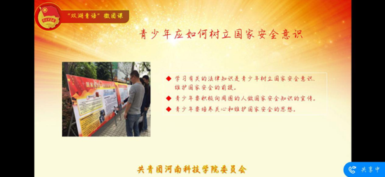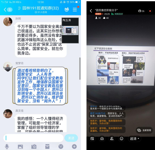 此次线上主题团课中,王莹老师首先向同学们讲解了《中华人民共和国国家安全法》的基本信息与国家安全的概念,使同学们对“全民国家安全教育日”有了基本了解。紧接着王莹老师就何为国家安全;当前国际国内形势;危害国家安全的行为及相关罪名;如何维护国家安全;谁来保卫国家安全这五大方面向同学们详细讲解了国家安全的重要性,并通过讲解实际案例的方式让同学们更直观的了解到危害国家安全的严重性。最后,王莹老师告诫同学们:“虽然我们生活在和平年代里的幸福一代,维护国家的安全也是我们每个人义不容辞的责任,也是热爱祖国的表现”。并且鼓励学生们不断提高全民国家安全意识,增强全民国家安全责任,形成维护国家安全的强大社会共识。此外,各个团支部在支部书记的带领下,通过线上视频通话共享屏幕的方式也有序有效的开展了此次团课活动。