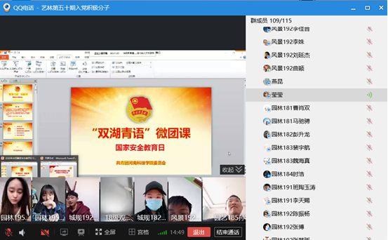 为深入学习宣传贯彻习近平新时代中国特色社会主义思想和党的十九大关于总体国家安全观、国家安全工作的部署要求,进一步提升广大青年生的国家安全意识,营造浓郁的国家安全教育氛围。2020年4月15日,校团委组织了全校各个团支部全体成员开展以“全民国家安全教育日”为主题的线上团课活动,园艺园林学院积极响应。此次线上主题团课以两种形式开展:在团委书记王莹老师的代领下集中学习;由各个团支部书记自行组织带领班级同学学习。意在强调国家安全的重要性,无论何时何地都不能掉以轻心,不能麻痹大意,要警钟长鸣,常抓不懈。