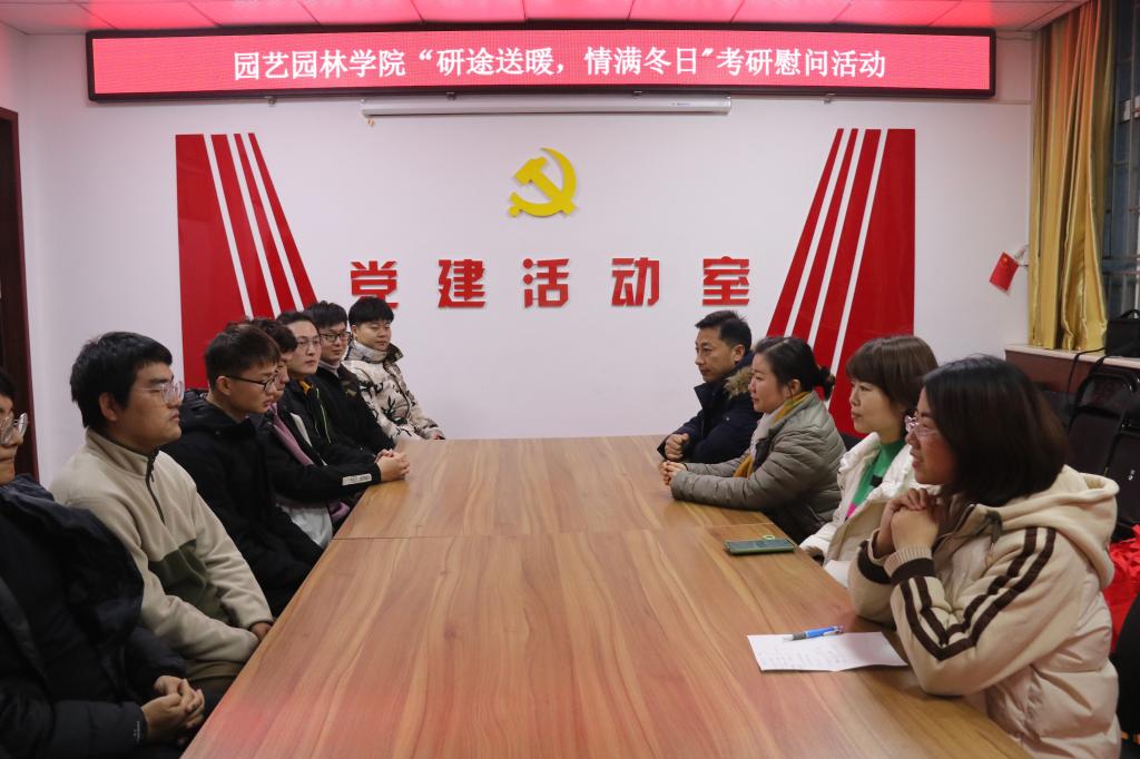 12月22日,园艺园林学院于实验楼B106会议室开展了“研途送暖,情满冬日”考研慰问活动。学院党委副书记朱黎娅及全体辅导员为考研学生送去了考试前夕的慰问和鼓励。