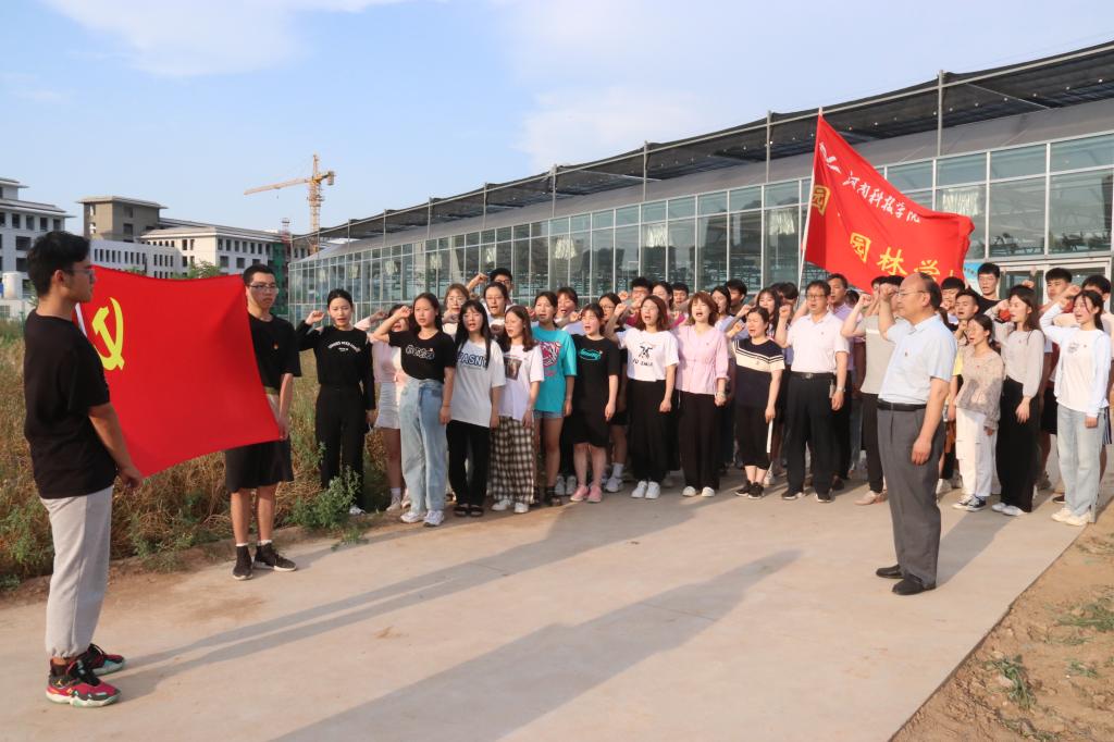 6月18日下午,园艺园林学院在新东校区教学科研基地开展新党员入党宣誓大会和“劳动最光荣,党员在行动”主题党日活动。学院党委书记郜庆炉、党委副书记朱黎娅、副院长沈军、全体辅导员及40名新发展党员参加宣誓仪式及主题党日活动。