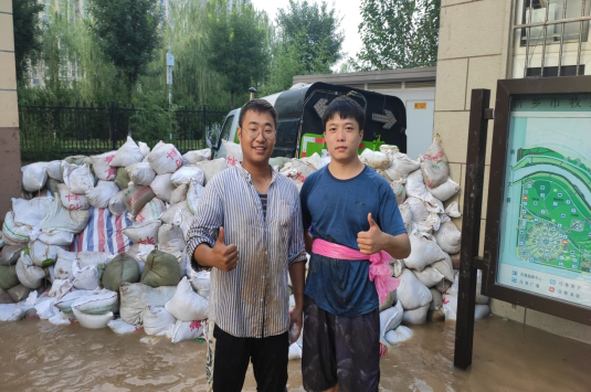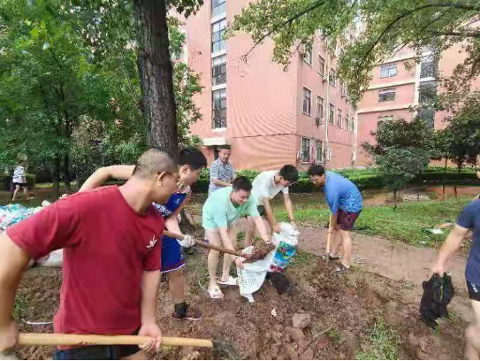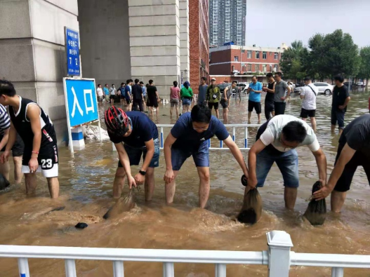 学院研究生、留校本科生响应学校号召,积极投身于学校大门的封堵,防止雨水进一步倒灌。趟雨水、运沙袋、排积水,卸物资,冲锋在前。