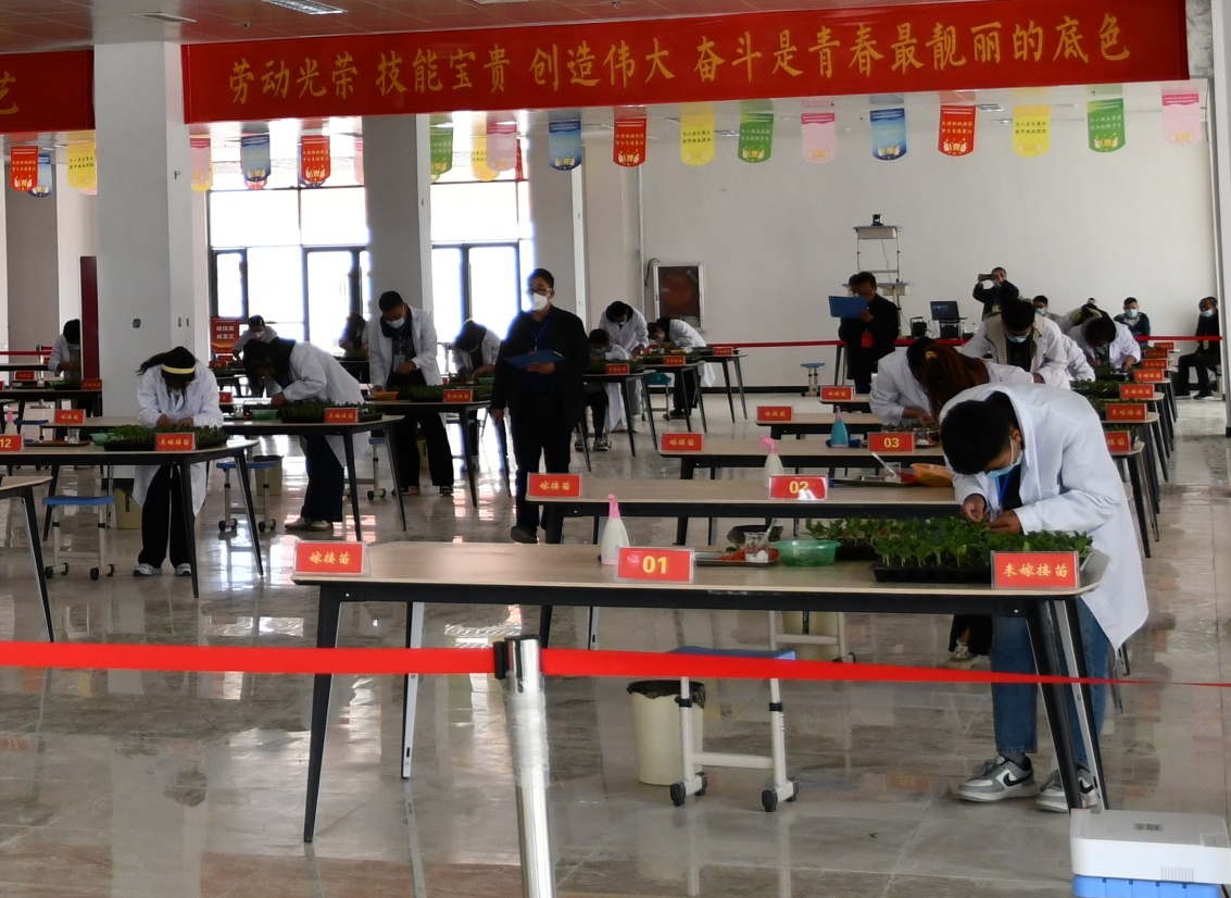 本次竞赛活动由河南省教育厅主办,河南省职业技术教育教学研究室承办,濮阳市教育局、濮阳县职业技术学校协办,同时也是2022年全国职业院校技能大赛中职组竞赛的省选拔赛。来自全省16个地市、42所学校、66名选手参加了比赛。本次竞赛赛项有理论测试、嫁接操作两个环节,其中嫁接操作又有砧木接穗识别和嫁接实操两项内容,嫁接实操又分西瓜单子叶贴接、黄瓜顶端插接、茄子劈接三项操作。