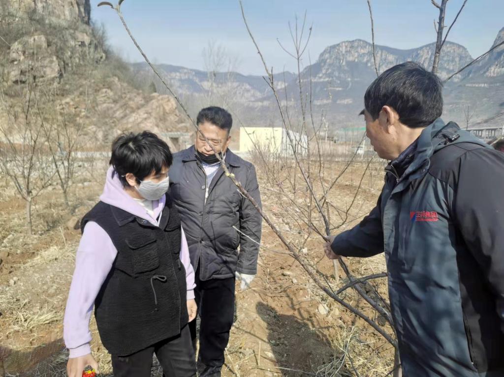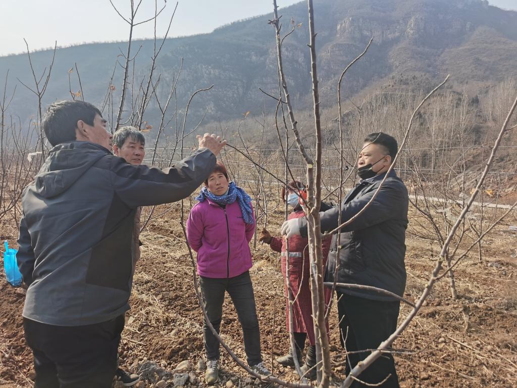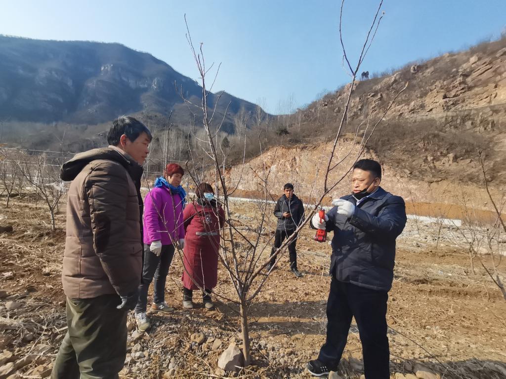 2月8日,园艺园林学院杨立峰副教授、周凯副教授和王智芳实验师到卫辉市太行山区西北部的狮豹头乡正面村的卫辉市德旺农业发展有限公司的果园,实地指导果园技术工人的苹果修剪。
