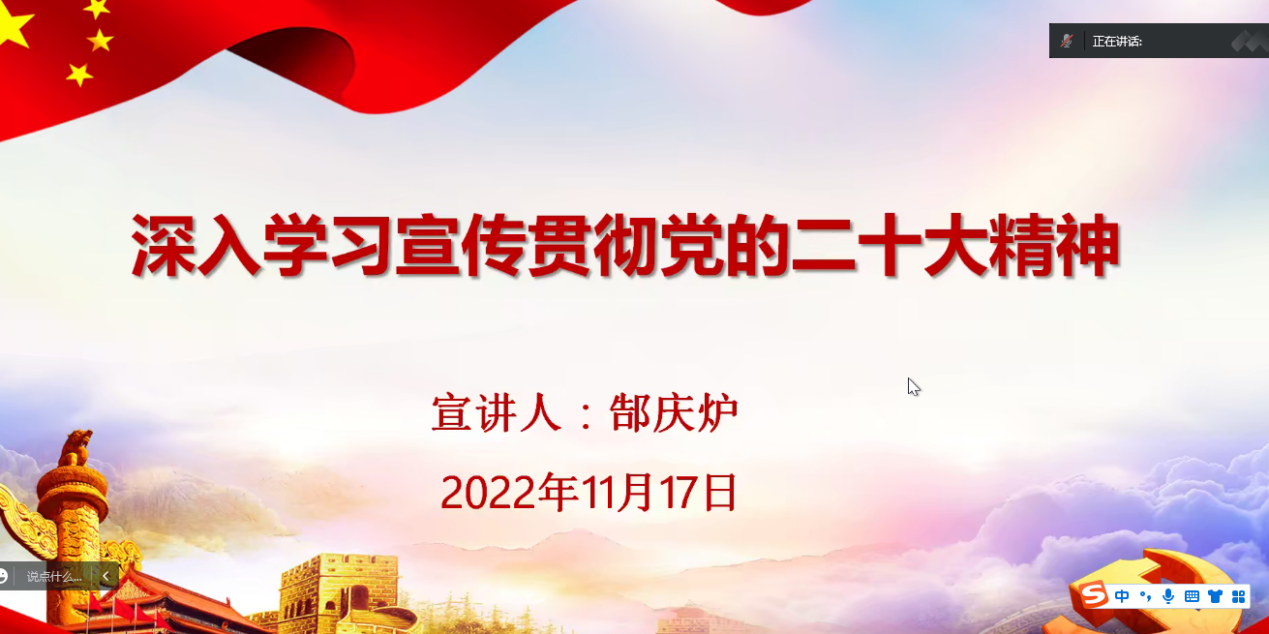 会上,郜庆炉以《深入学习宣传贯彻党的二十大精神》为题,重点围绕党的二十大主题和主要成果、过去5年的工作和新时代10年的伟大变革、马克思主义中国化时代化、中国式现代化、全面建设社会主义现代化国家的目标任务、坚持党的全面领导和全面从严治党、应对风险挑战等7个方面,对党的二十大精神进行了宣讲。