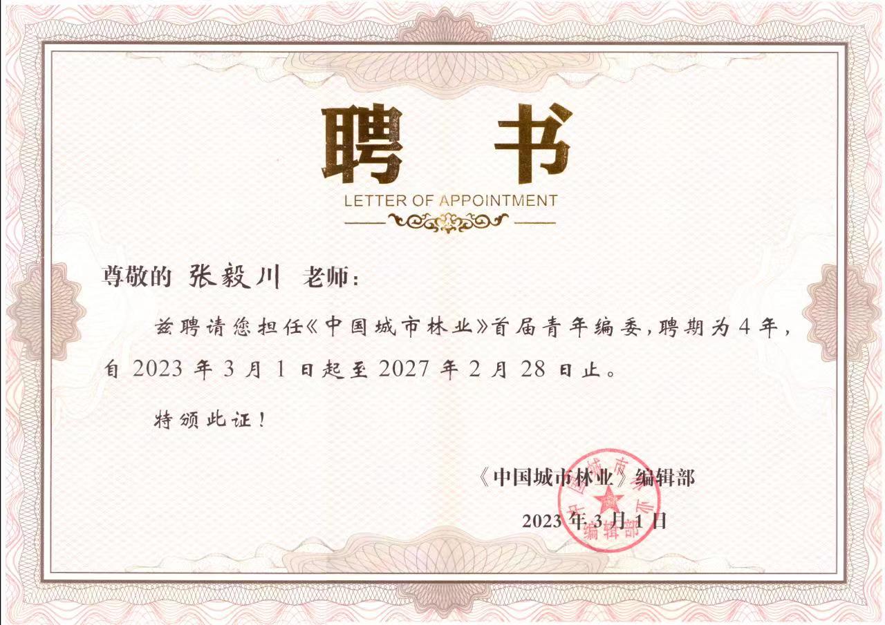 在《中国城市林业》创刊二十周年之际,期刊编辑部公布了首届青年编委名单,园艺园林学院张毅川教授入选。张毅川多年来主要从事废弃地生态修复及景观重建、海绵城市及绿地、城市生态绿量等研究,在这些领域发表了高水平论文,并获河南省科技进步二、三等奖、发明专利等,研究成果得到了评委会的认可。此次入选也是园艺园林学院教师首次在风景园林规划设计领域重要专业期刊中担任编委会成员。张毅川教授还担任《Forests(SCI, IF=3.282)》《Land(SCI, IF=3.905)》《Sustainability(SSCI\SCI, IF=3.889)》《Remote Sensing(SCI, IF=5.349)》《Water(SCI, IF=3.530)》等国际期刊审稿人。