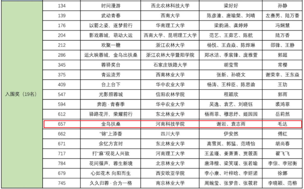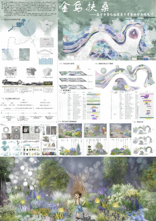 竞赛自2023年4月发布方案征集公告以来,受到了全国各地高校的广泛关注,共收到来自全国105所高等院校1082人的有效参赛作品449组,进入提名终评环节的入围作品仅39组。园艺园林学院毛达副教授指导的研究生谢岩、袁志雨的参赛作品《金乌扶桑》以金乌鸟、扶桑树等古蜀文化符号为主题进行了花境设计,荣获入围奖。