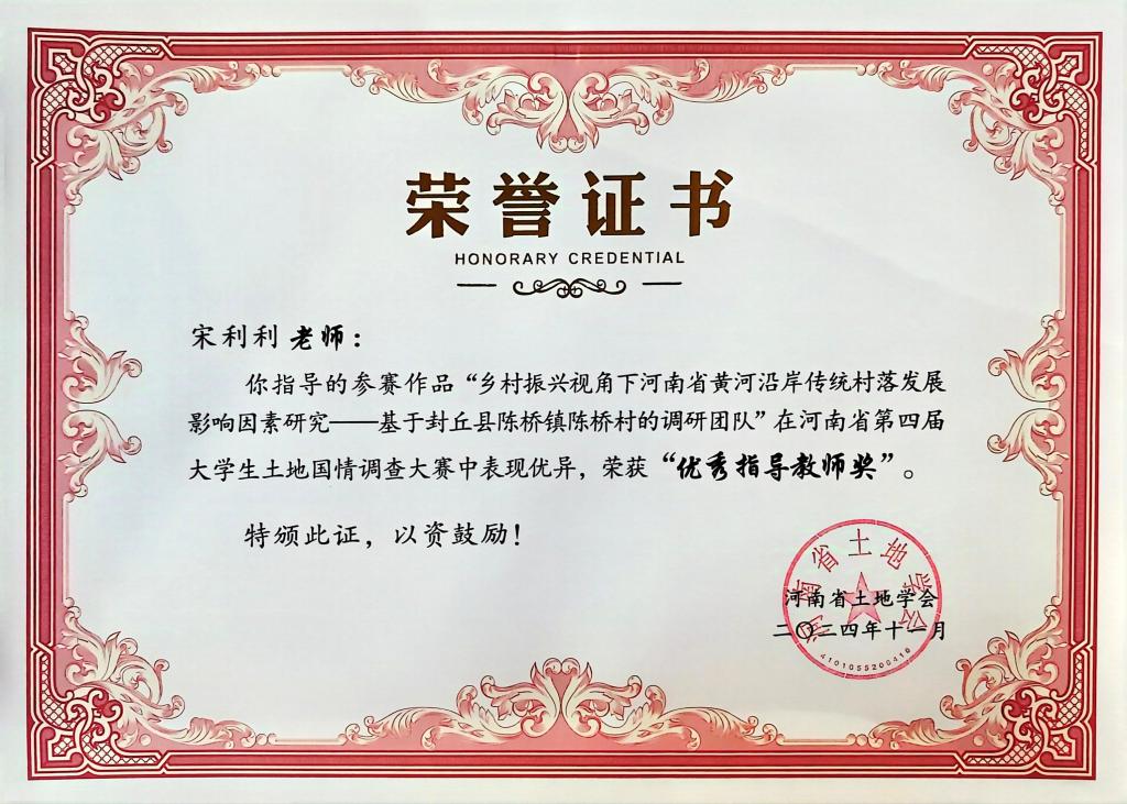 近日,由河南省自然资源厅指导,河南省土地学会主办,河南农业大学承办的河南省第四届大学生土地国情调查大赛在郑州河南农业大学举行,来自全省18所院校的74份作品参加决赛。由我院宋利利老师指导的城乡规划专业本科学生(韩炅玉,刘懿琳,黄旭清,于抒含,黄兴)组成的队伍团结协作,表现出色,其作品《乡村振兴视角下河南省黄河沿岸传统村落发展影响因素研究—基于封丘县陈桥镇陈桥村的调研》作品荣获一等奖,宋利利老师荣获优秀指导老师奖。