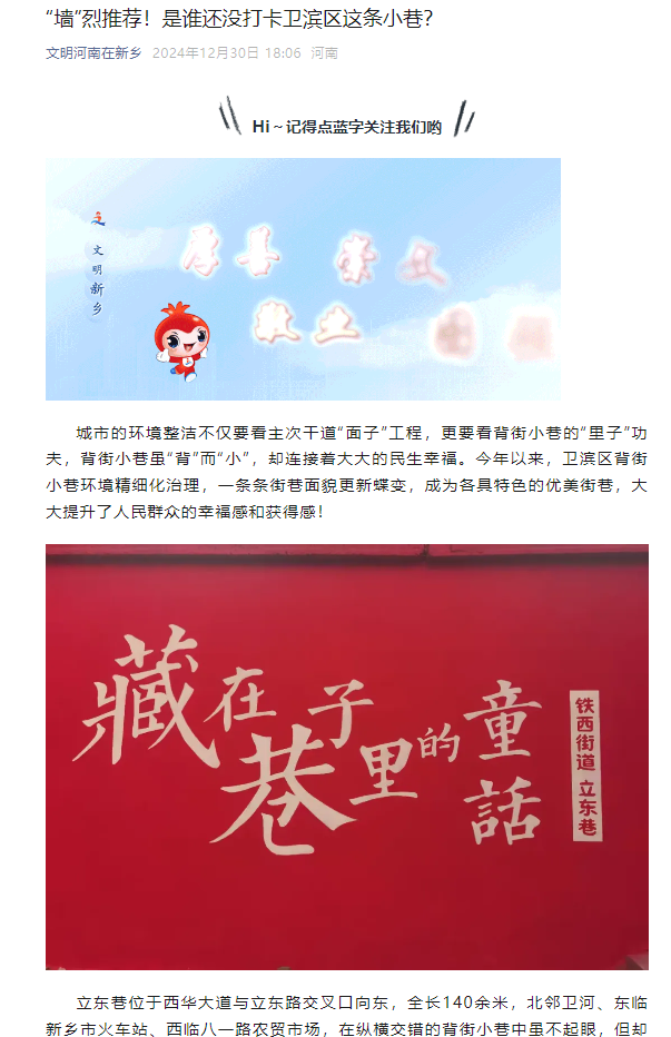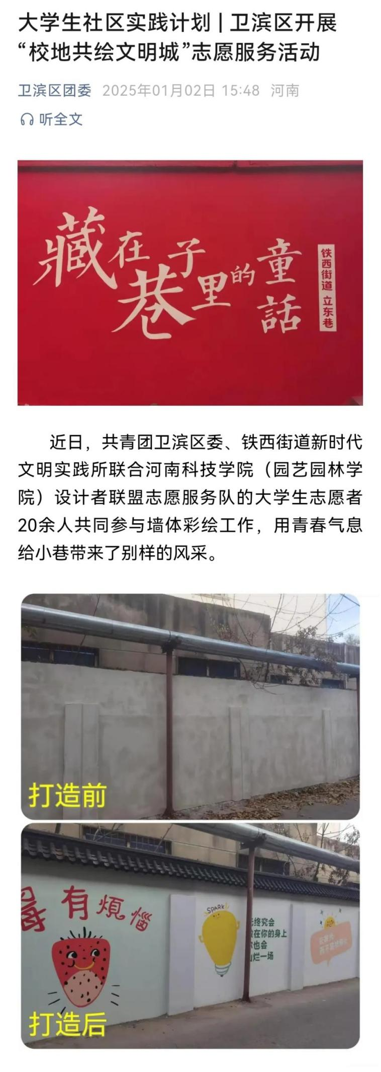 近日,共青团卫滨区委、铁西街道新时代文明实践所联合河南科技学院园艺园林学院开展“校地共绘文明城”墙体彩绘志愿服务活动。一笔笔的精心勾勒,设计者联盟志愿服务队用青春气息给小巷带来了朝气与活力。新乡日报、卫滨区团委等媒体对该活动进行宣传报道。