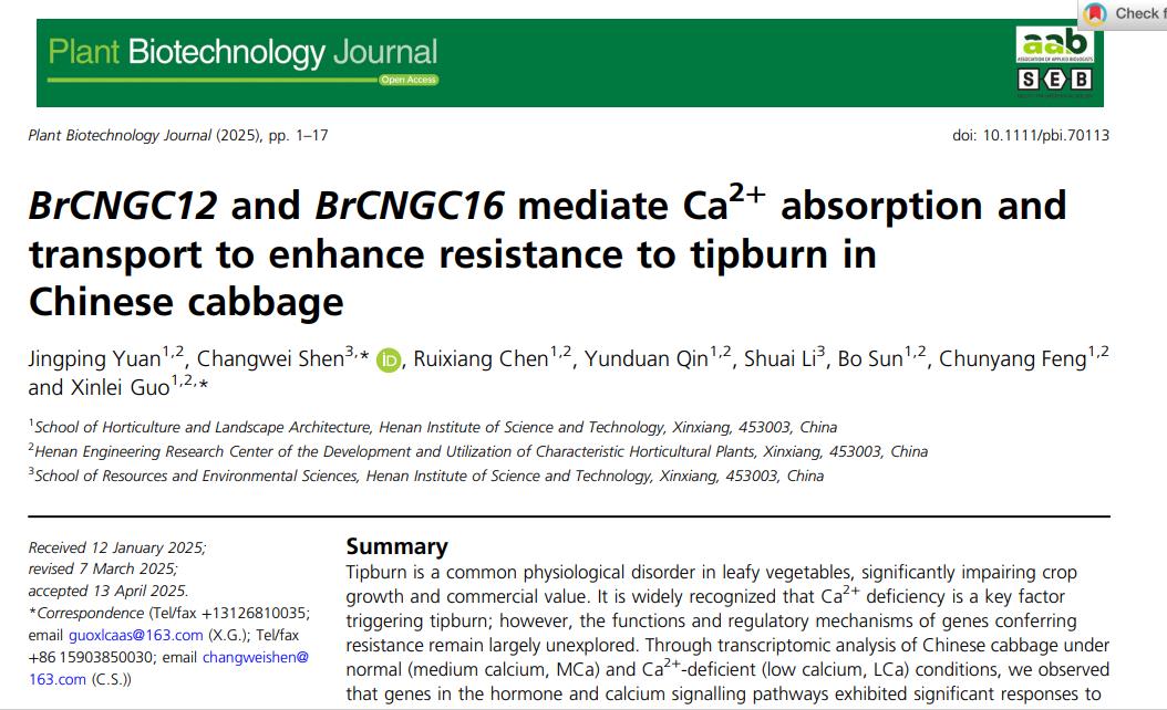 5月3日,园艺园林学院白菜种质资源挖掘与创新利用团队袁敬平教授在植物学顶级期刊《Plant Biotechnology Journal》(中科院一区Top,IF:11.2)发表题为“BrCNGC12 and BrCNGC16 mediate Ca2+absorption and transport to enhance resistance to tipburn in Chinese cabbage”的研究论文。河南科技学院为论文唯一署名单位,园艺园林学院袁敬平博士为第一作者,植物保护与环境学院/蜜蜂学院申长卫博士和园艺园林学院郭新磊博士为共同通讯作者,研究生陈瑞祥、秦云端、李帅、孙博、冯春阳参与了此工作。