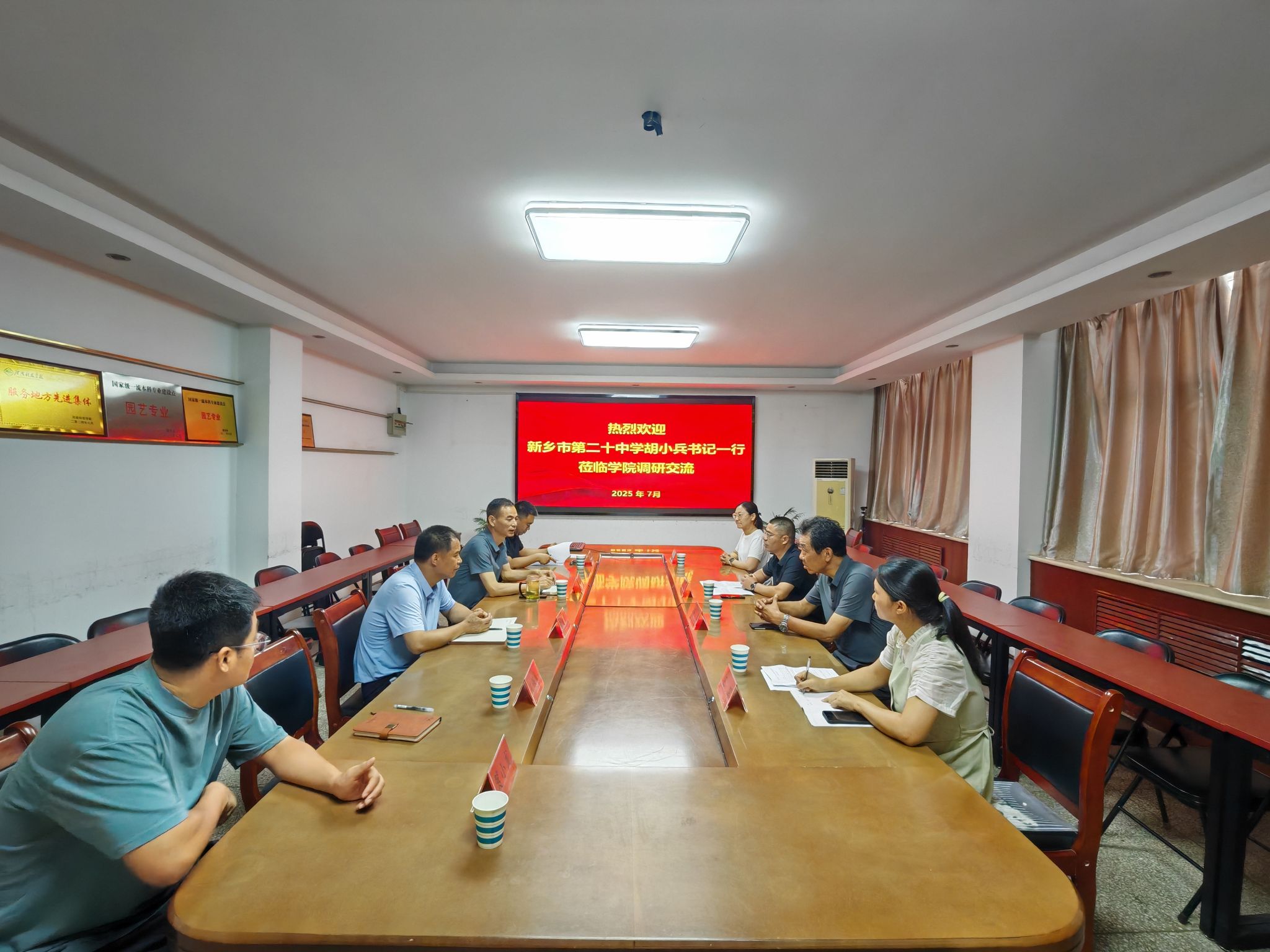 7月1日上午,新乡市第二十中学党委书记胡小兵、副校长李军等一行4人到我院开展合作交流。学院党委书记郭超杰,副院长张毅川、贾文庆,办公室、校内实习实训基地负责人参加会议。会议由副院长张毅川主持。
