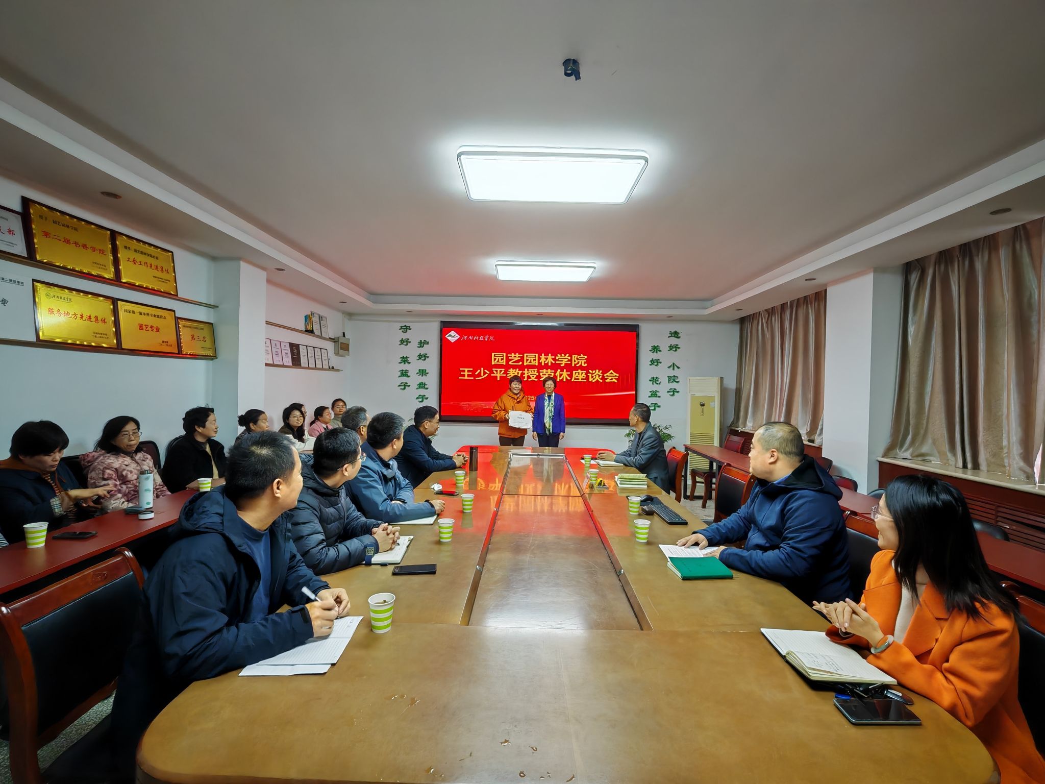 10月24日下午,园艺园林学院在实验楼B316会议室召开王少平教授荣休座谈会,校纪委书记王莉华出席会议,学院党政领导班子成员、教师代表等参加了荣休座谈会。座谈会由学院党委副书记王占魁主持。