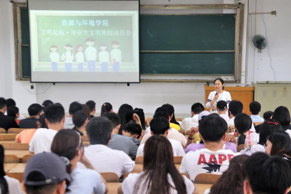 为确保2019届毕业生安全、有序、文明离校,切实维护学校的和谐、稳定,5月16日下午,资源与环境学院在零合三教室召开“文明起航”主题教育系列活动--2019届毕业生文明离校动员会。参加本次会议的有学院团委书记姜丽娟、辅导员宋晓珂以及2015级全体毕业生。