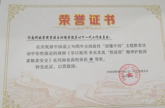 日前,从河南省教育厅获悉,在庆祝新中国成立70周年全国高校“读懂 中国”主题教育活动中,我校资源与环境学院拍摄的短视频《学以致用务实求真“铁屁股”精神护航国家粮食安全》获河南省高校特等奖。