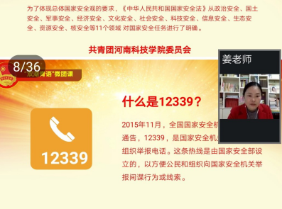 在第五个全民国家安全教育日到来之时,为加强同学们的国家安全意识,提高防范和抵御安全风险能力,资源与环境学院于2020年4月14日下午18:30围绕“全民国家安全教育日” 通过线上直播的方式开展主题团课。