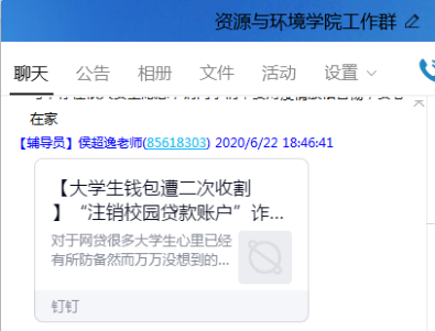 为增强学生征信意识、金融风险意识、法律意识,根据校党委学工部、学生处《关于开展学生资助诚信教育主题活动的通知》的要求,6月12日-6月30日,资源与环境学院开展2020年学生资助诚信教育主题活动。