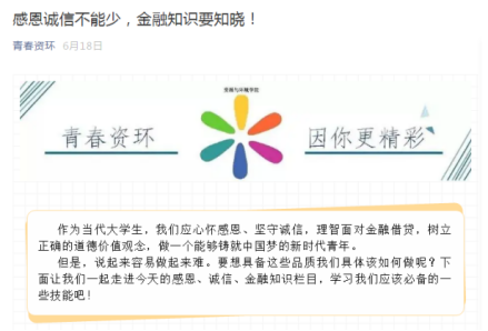 活动期间,院全体学生积极参加各项主题活动。6月12日-6月20日,资环学院面向全院学生开展“树立诚信观念、防范金融风险”主题征文比赛与微信文案宣传,引导学生树立正确的消费观、诚信观、价值观。6月20日-6月30日,学院进行线上诚信、金融知识宣传教育,积极组织学生参加学校线上答题,普及金融、贷款、征信知识,提高学生法律意识和信用意识。
