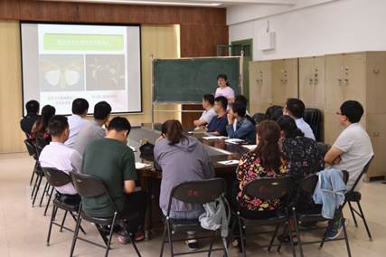 在教学技能展示环节,采取“课堂教学+教学阐释”的形式,课堂教学环节20分钟,教学阐释环节5分钟。孔凡彬、王颖、张强和李涵四位老师分别展示了《植物病害化学防治策略及作用机理》、《植物检疫的起源与概念》、《病原物侵染过程》和《好氧活性污泥》。苏喜庆老师认为导入自然、语言流畅、图文并茂、思政元素融入较好;同时指出在站姿、图片处理、板书设计等方面需进一步提升。随后,苏喜庆老师以《文本层次—言语层》为例做了一场精彩的示范课。示范课结束后,全体参会教师就如何进行教学设计、提高教学质量进行了热烈讨论。