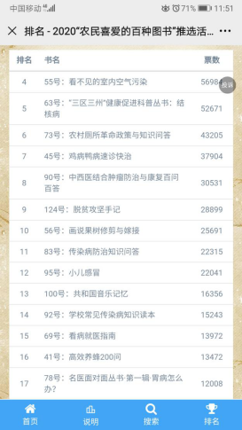 该活动在《2020年农家书屋重点出版物推荐目录》的基础上推选,以公平、公正、公开,严谨、科学、权威为原则,经过农民群众和地方宣传部门推荐、专家初评、网络投票、专家终评四个环节展开。经过面向基层广泛征集后,共推荐出1073种图书;经专家初评,推选出政经类、科技类、医卫生活类、文化类、少儿类等5类共194种图书进入网络投票环节。