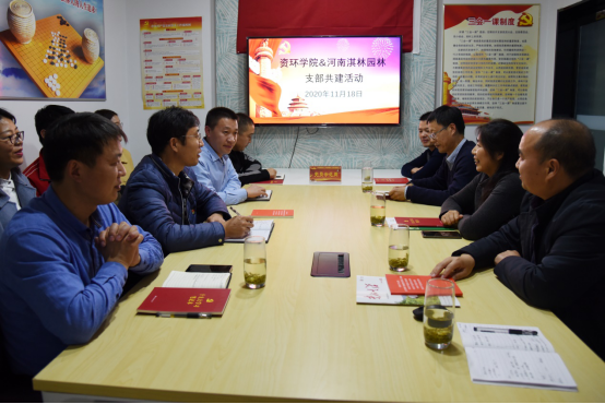 为了不断加强基层的党组织建设,促进党建在各项工作中的引领作用,11月18日下午,资源与环境学院党委书记高扬帆、院长王洪亮、党委副书记刘军锋、支部书记孔凡彬、李松伟等一行5人到河南淇林园林技术有限公司,举行校企党支部共建活动。河南淇林园林技术有限公司总经理、党支部书记王清峻及支部主要党员参与座谈共建会。