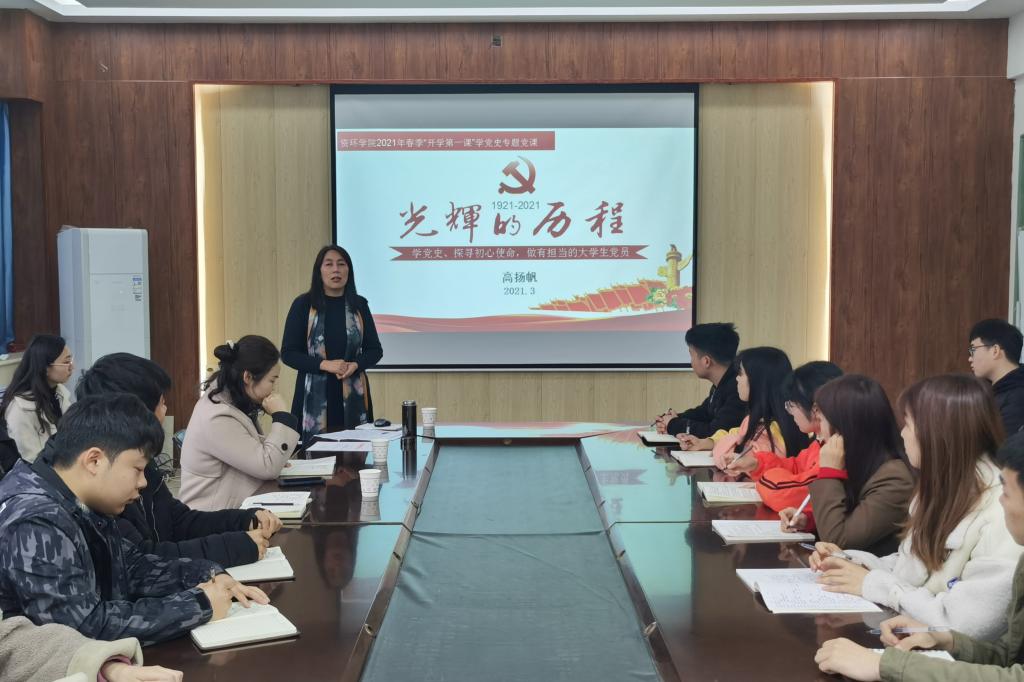 动员大会结束后,高扬帆以“学党史、探寻初心使命,做有担当的大学生党员”为题,从“党史学习意义及发展脉络”、“新民主主义革命时期”、“社会主义革命和建设时期”、“改革开放和社会主义个现代化建设时期”与“做有理想有担当的大学生党员”五个方面讲解了我党从1921年到2021年的光辉历程。她指出,学生党员干部要以身作则,积极投身党史学习教育活动中,并且带动全体学生共同参与到党史学习教育的活动中。