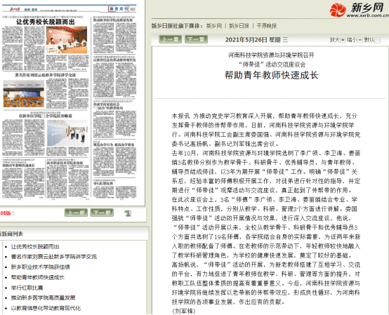 5月26日,新乡日报以师带徒活动“帮助青年教师快速成长”为题,报道资源与环境学院开展的师带徒交流座谈会。