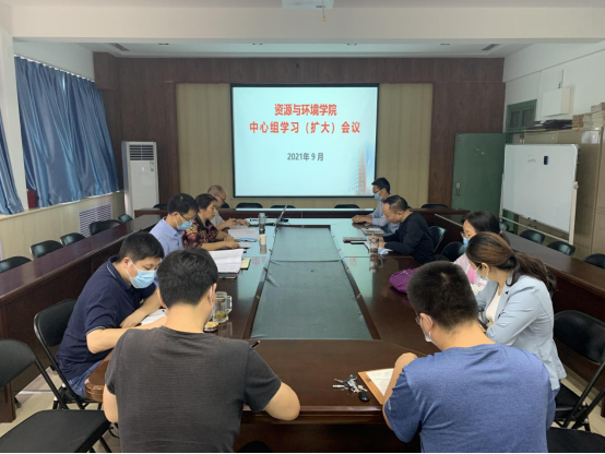 9月23日,资源与环境学院在实验楼E307会议室举行党委理论中心组(扩大)学习会议。学院党政领导及全体党支部书记参加会议。会议由党委书记高扬帆主持。