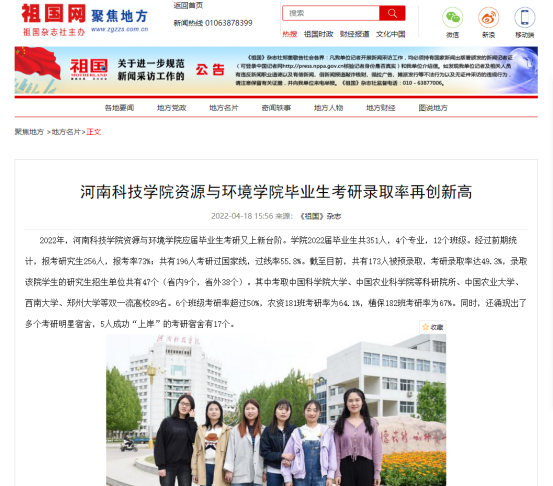 【祖国网】《河南科技学院资源与环境学院毕业生考研录取率再创新高》